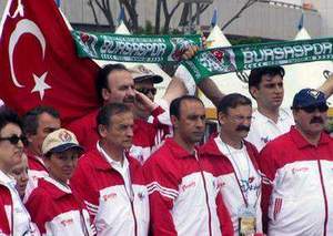 这时,体育场里突然传来雄壮的中国国歌声。想来是音响师正在调试设备,确保下午在比赛时万无一失。场外的中国球迷因此开始兴奋了,他们挥舞着手中的国旗,很高兴地跳着,喊着。旁边的土耳其球迷也不甘示弱,也将国旗舞起来。于是,满眼的红色蔓延开来,围住了白色的体育场。