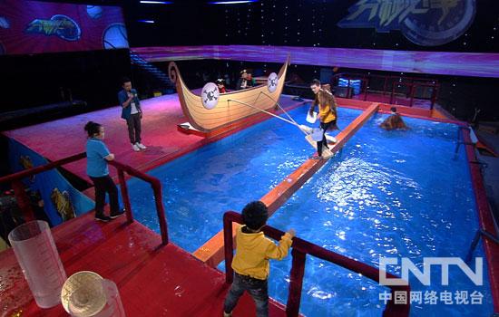 三组选手同时进行比赛,老爸每人手提2桶水,依次通过独木桥往对面量筒里运送尽量多的水,桥旁边有两个工作人员和三个孩子扮成海盗荡起悬空的两个大球和三个小球,阻碍运水者过桥。